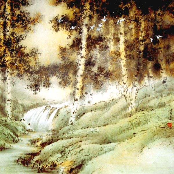 #01-103 樺林秋色 Autumn Birches by the Stream Painted in 1997