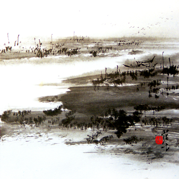 水墨設色紙本 - 單宣 Chinese ink & Colour on Rice paper 14” x 14”