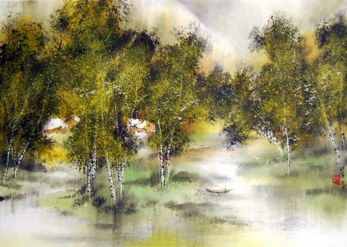 #01-240 樺林秋晚 Autumn Birches by the Stream Painted in 2001